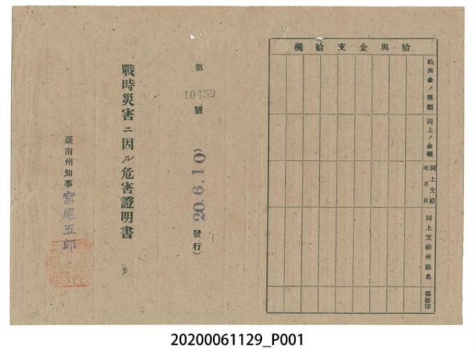 戰時造成的意外災害證明書第10459號(昭和20年6月10日發行)