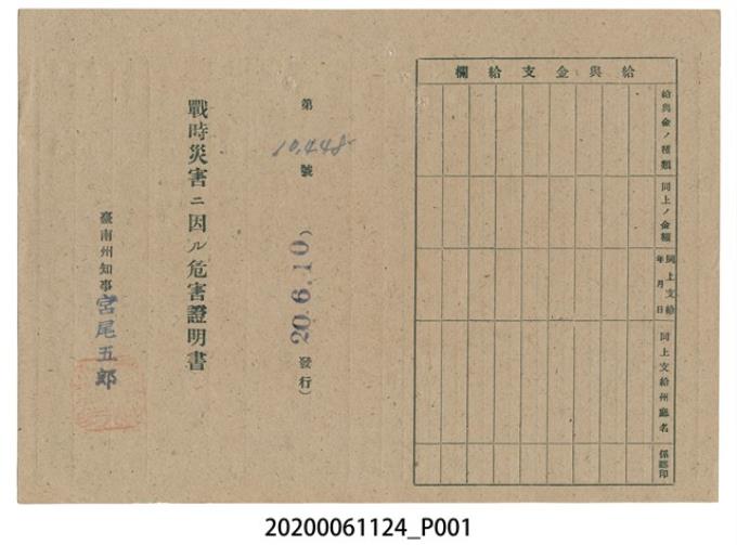 戰時造成的意外災害證明書第10448號(昭和20年6月10日發行)