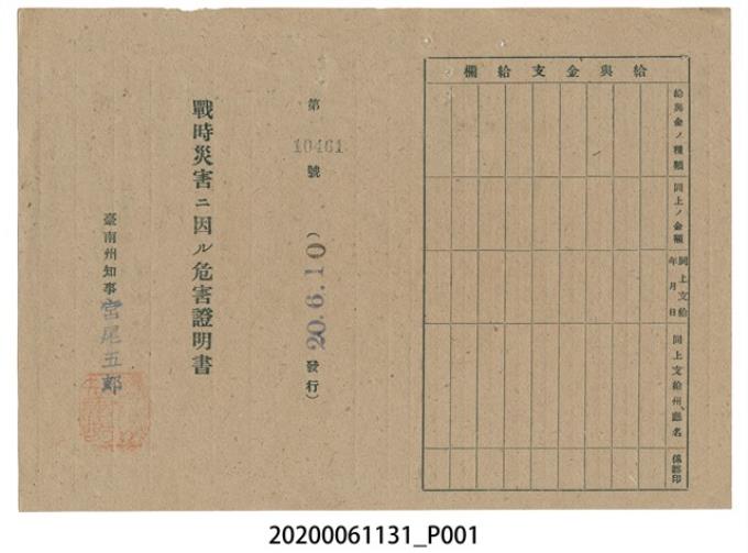 戰時造成的意外災害證明書第10461號(昭和20年6月10日發行)