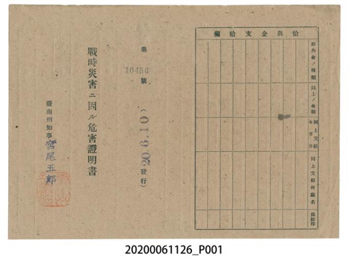 戰時造成的意外災害證明書第10456號(昭和20年6月10日發行)