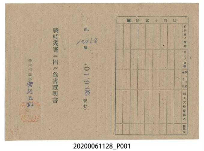 戰時造成的意外災害證明書第10458號(昭和20年6月10日發行)