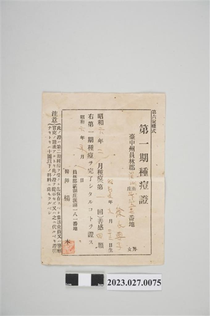 1931年2月徐氏雪子第一期種痘證