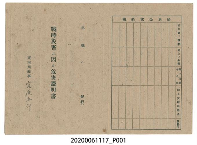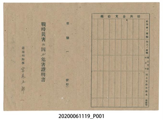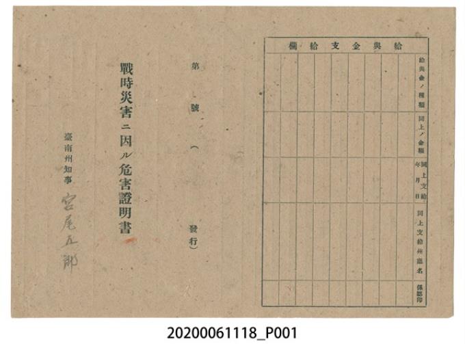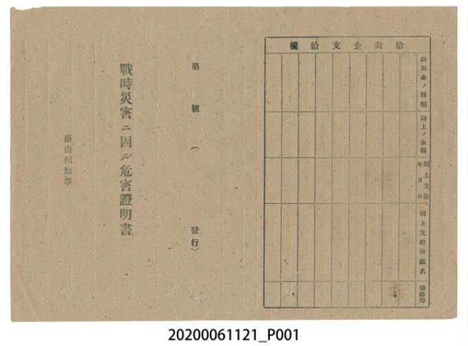 戰時造成的意外災害證明書第8721號(昭和20年5月30日發行)