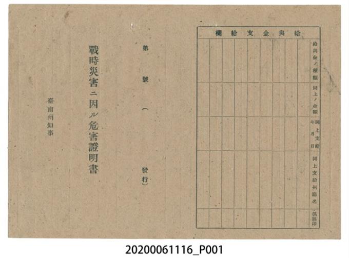 1945年5月20日姜滿家族之戰時造成的意外災害證明書與交付申請書