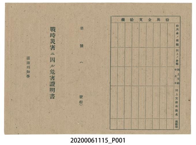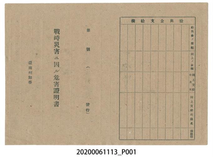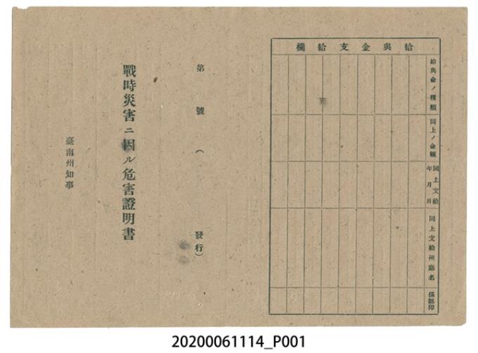 1945年4月28日吳水助家族之戰時造成的意外災害證明書與交付申請書