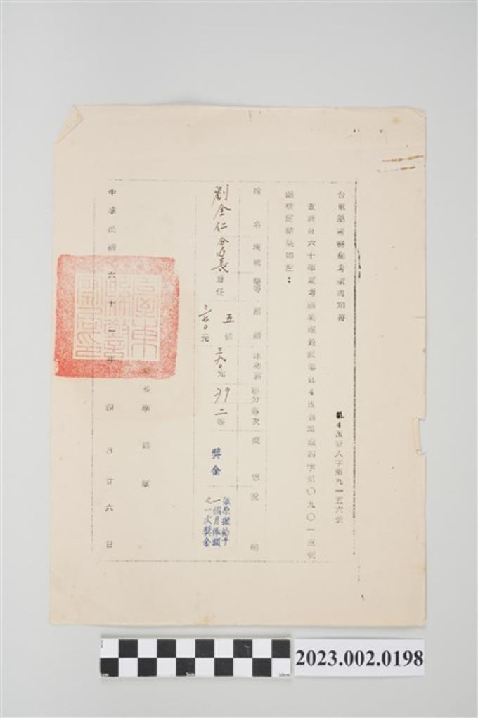 民國61年4月26日劉全仁台東縣警察局考績通知書