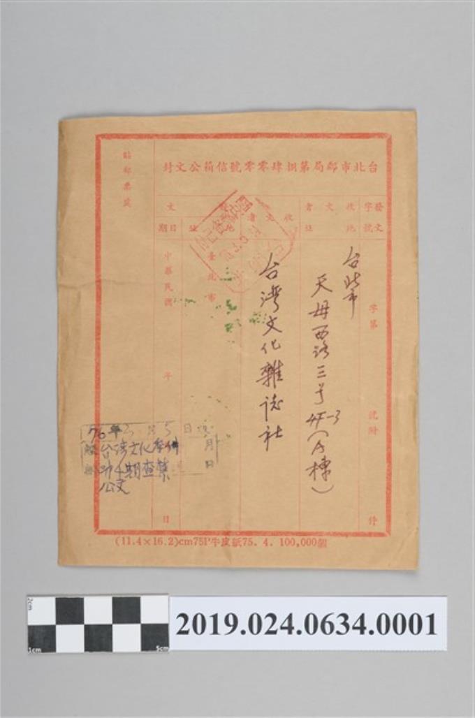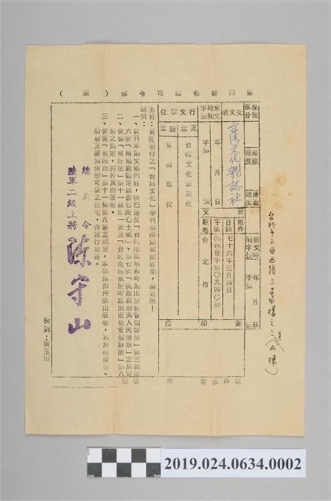 1987年3月5日警備總部查禁《台灣文化季刊第四期》查禁公文封