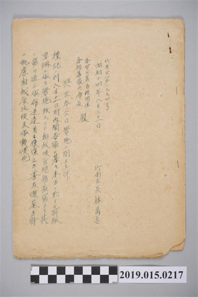 昭和14年8月31日竹南庄長林萬吉給各官公署、各種團體、各部落振興會長公文
