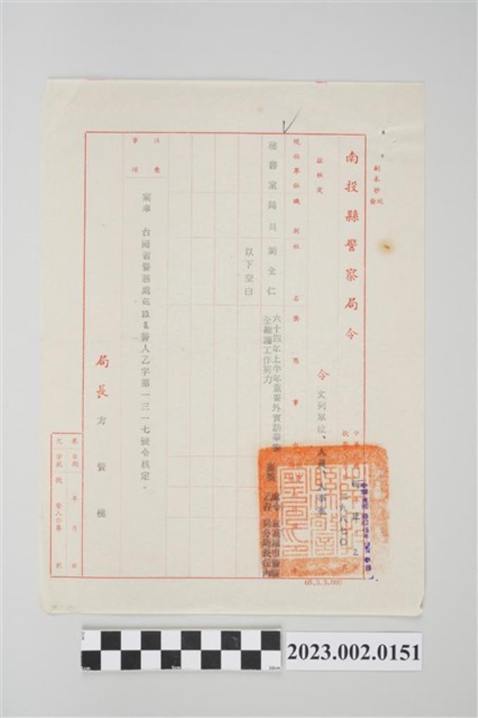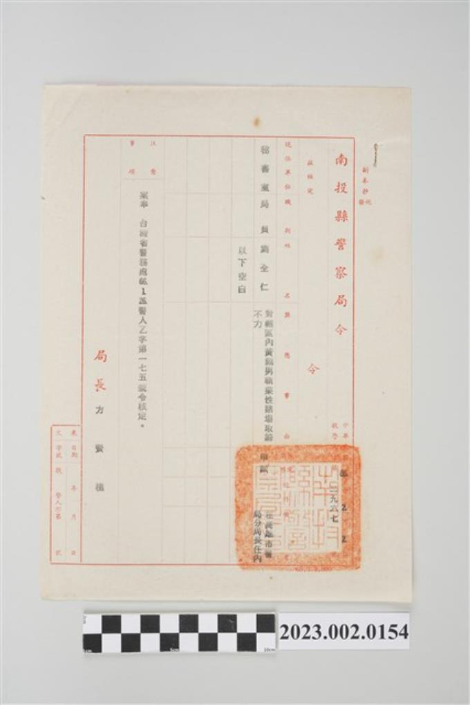民國65年10月20日劉全仁南投縣警察局令