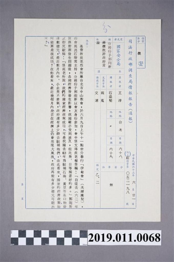 1974年司法行政部調查局情報報告公文