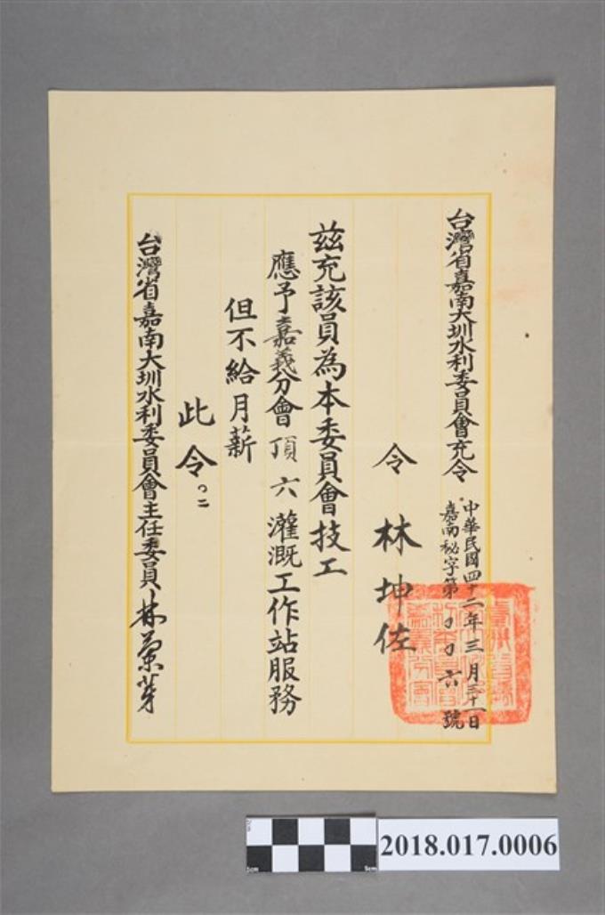 臺灣省嘉南大圳水利委員會充令發予林坤佐