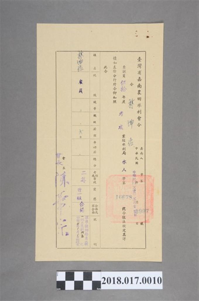 1962年臺灣省嘉南農田水利會令發予林坤佐考成通知