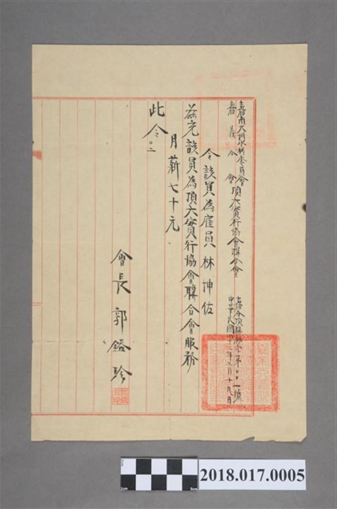 嘉南大圳水利委員會嘉義分會頂六實行協會聯合會發予林坤佐人事派令