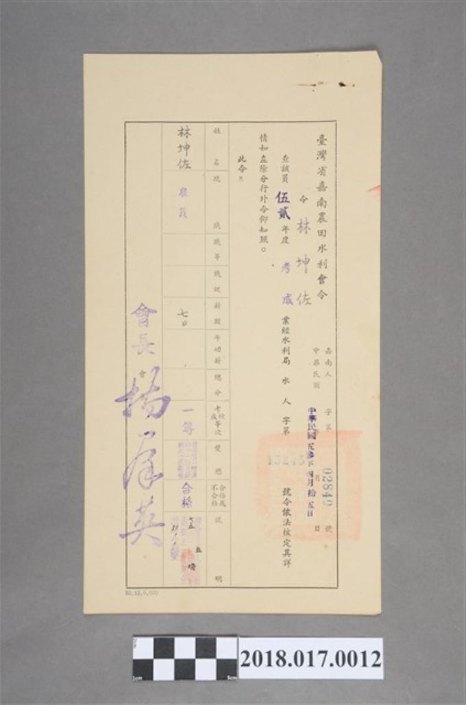 1961年臺灣省嘉南農田水利會令發予林坤佐考成通知