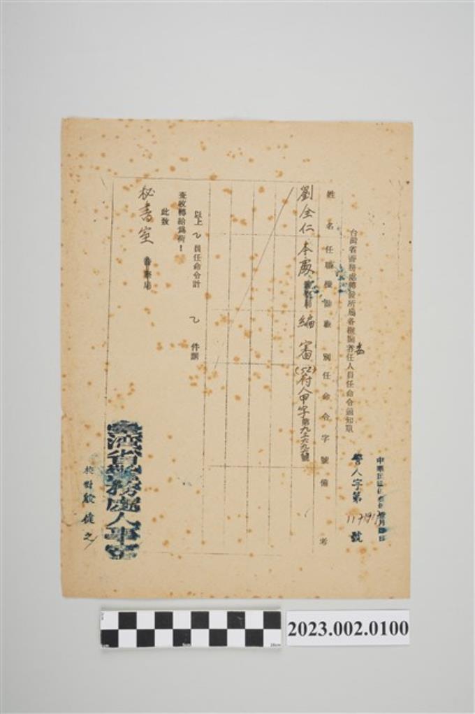 民國53年1月4日劉全仁台灣省警務處轉發所屬各機關委任人員任命令通知單