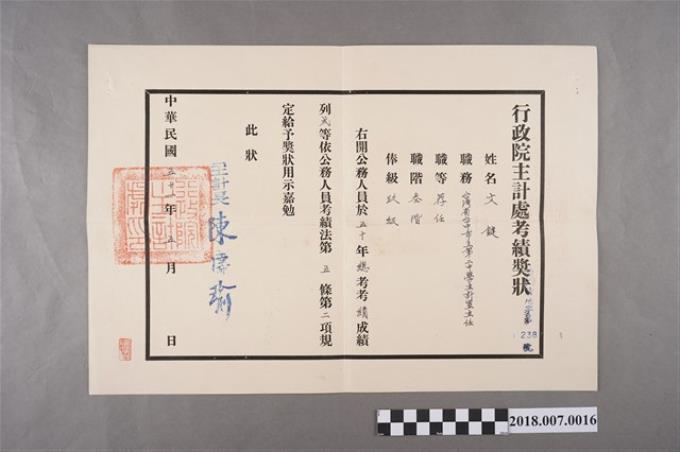 1962年文鍵獲頒行政院主計處考績獎狀