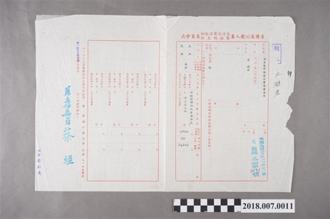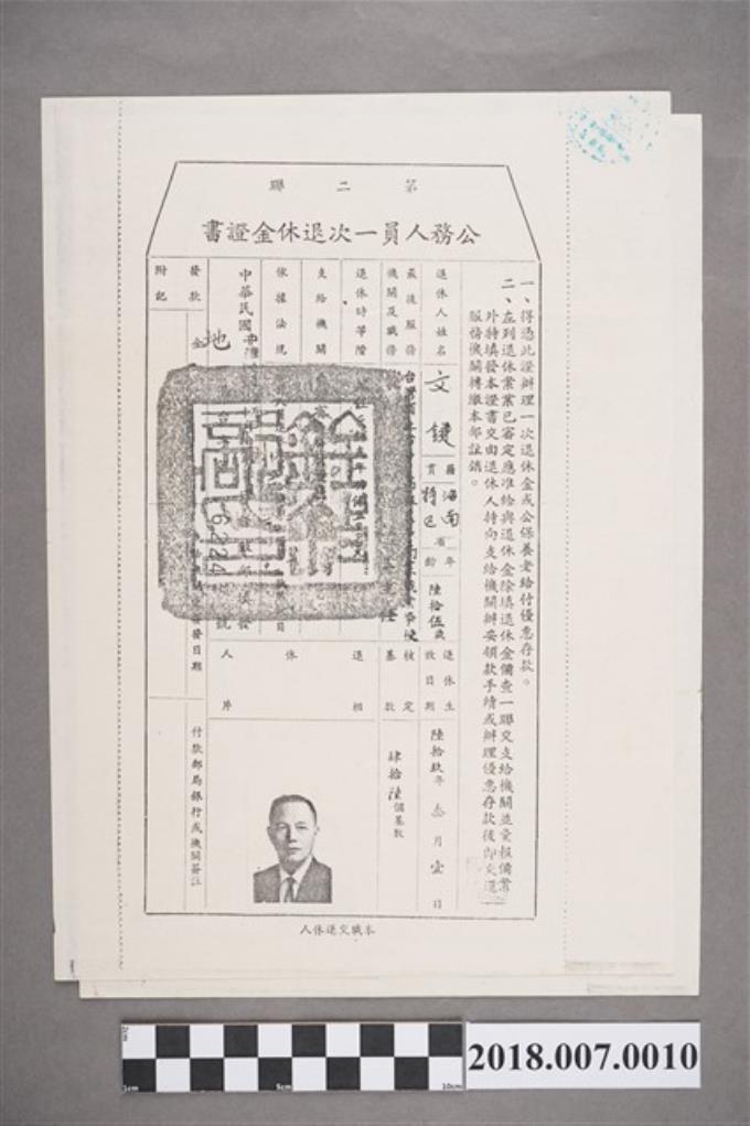 文鍵公務人員一次退休金證書第二聯影本