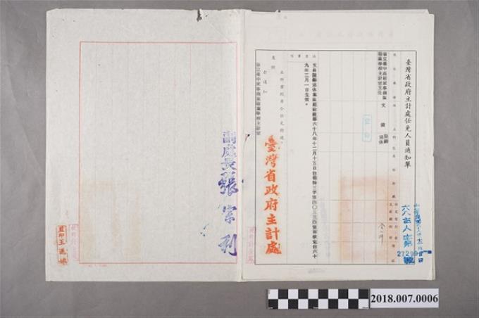 臺灣省政府主計處任免人員通知單給文鍵