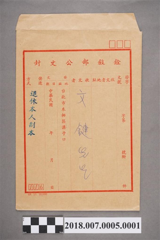 銓敘部函給文鍵第40334號之副本信封