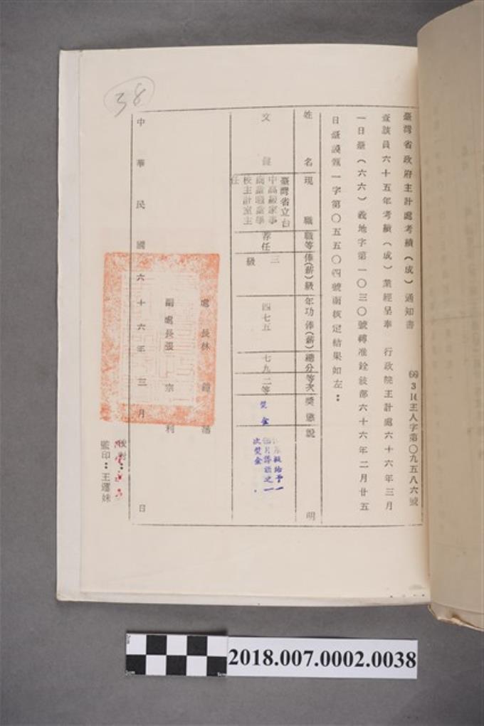 文鍵臺灣省政府主計處中華民國66年考績(成)通知書