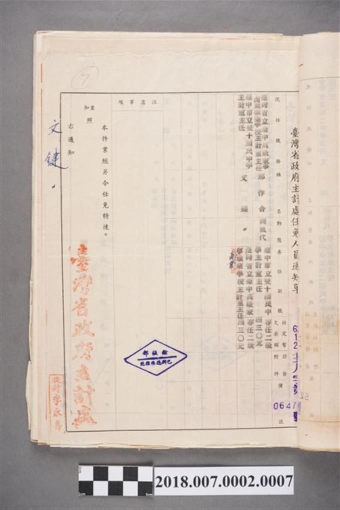 文鍵任臺中高級家事商業職業學校主計室主任之臺灣省政府主計處任免人員通知書