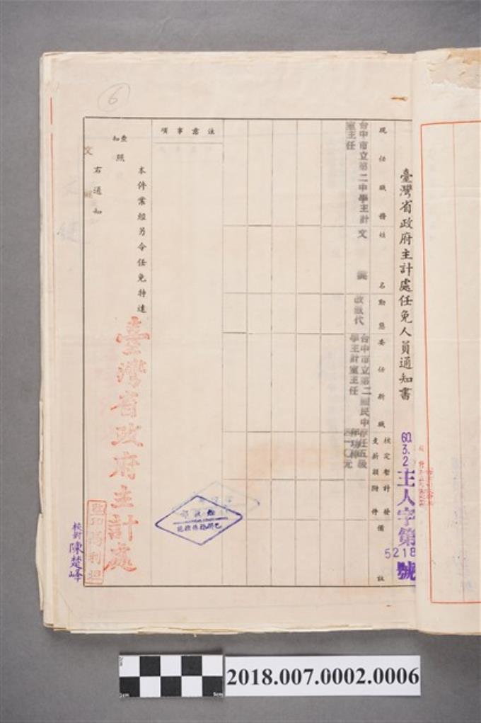 文鍵臺中市立第二國民中學主計室主任之臺灣省政府主計處任免通知書