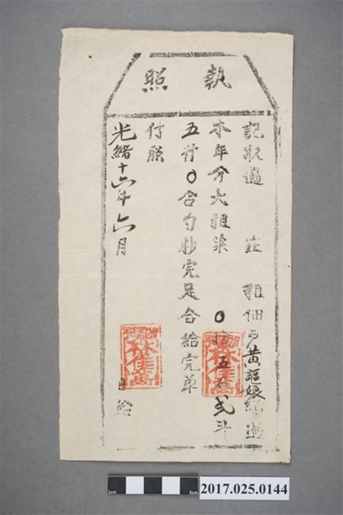 同治11年(1872年)旱坑仔庄佃戶許佛佑執照