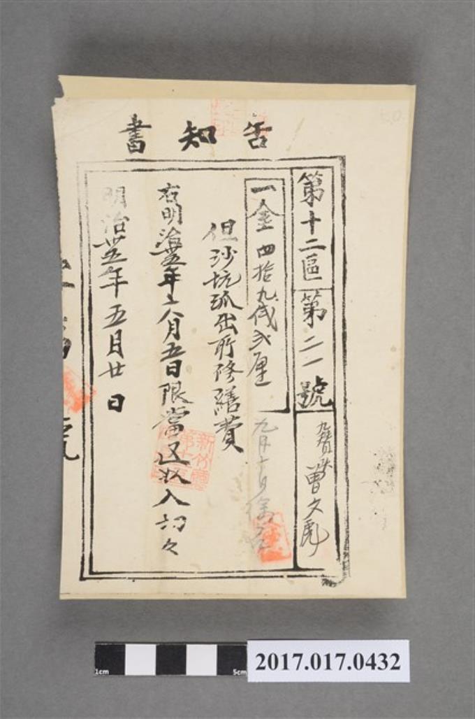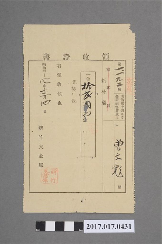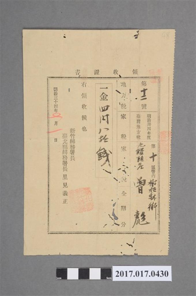 明治34年5月1日曾彪地方稅家稅領收證