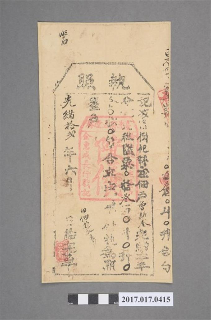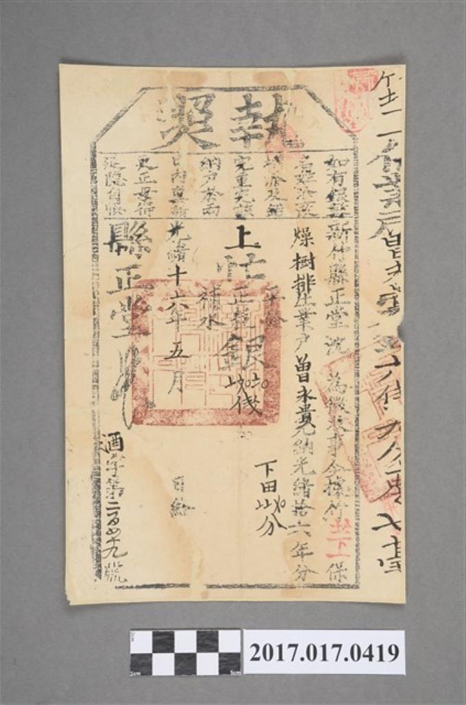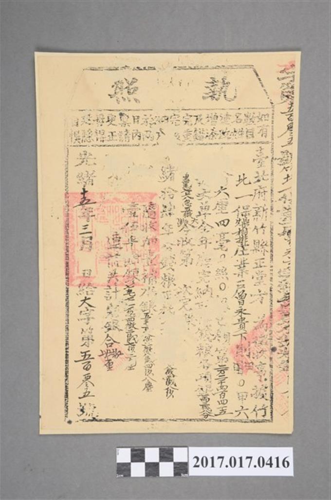 光緒12年佃戶曾新奎開墾執照(蓋臺北府正堂)