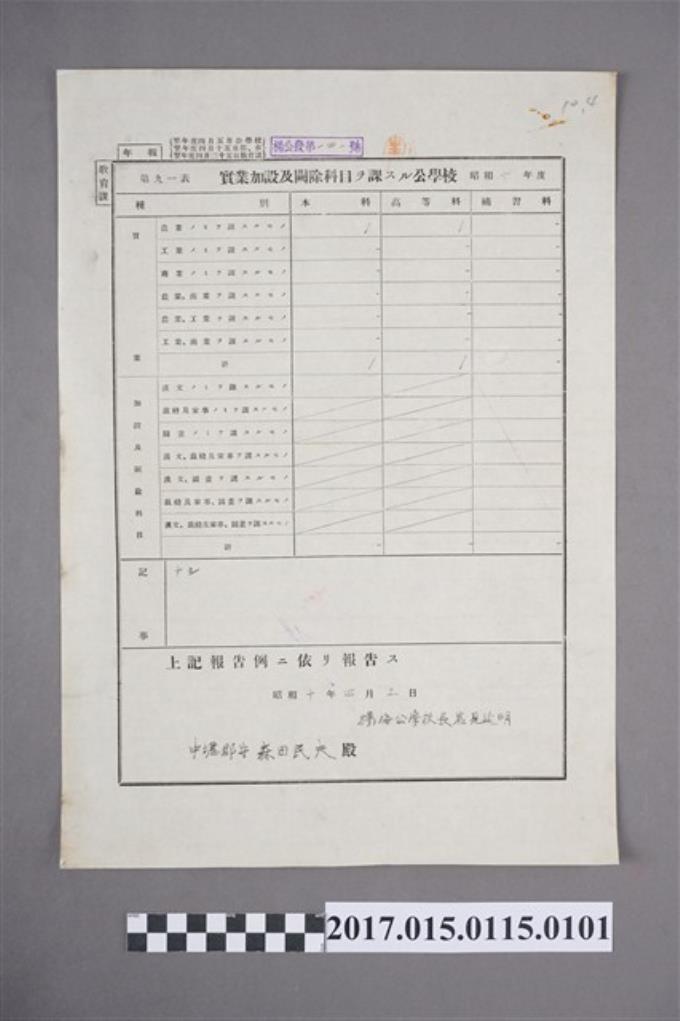 楊梅公學校實業加設及闕除科目ラ課スル公學校