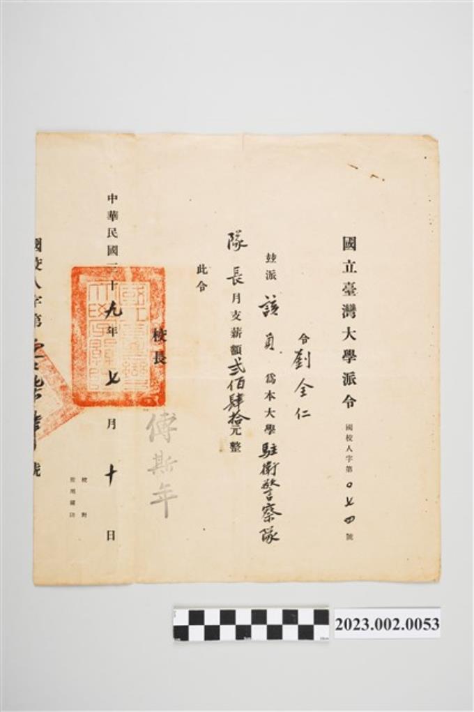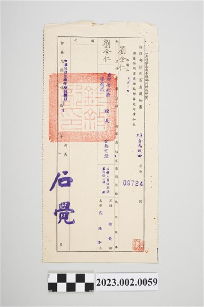 民國53年7月4日劉全仁銓敍部任用審查通知書