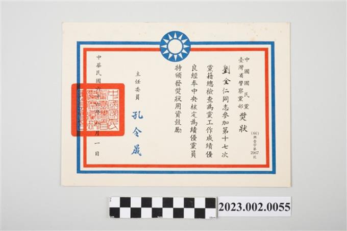 民國66年8月1日劉全仁中國國民黨臺灣省警察黨部獎狀