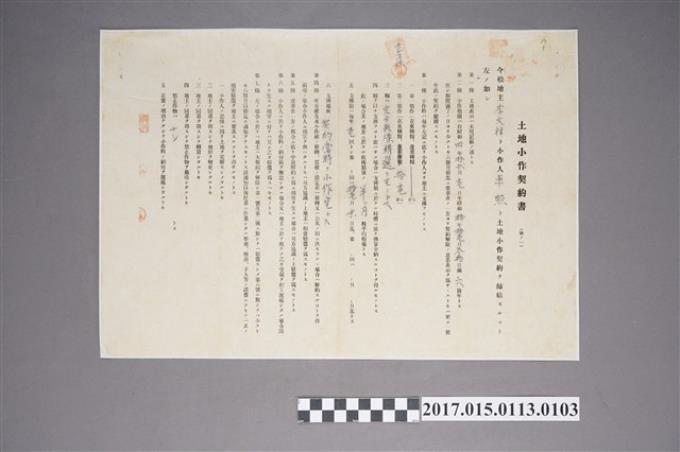 高雄州旗山郡內門莊內埔參七參番地之地主李文祥與小作人卓照之土地小做契約書(前半)