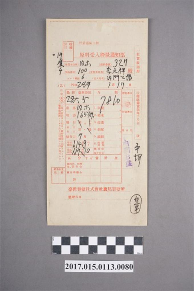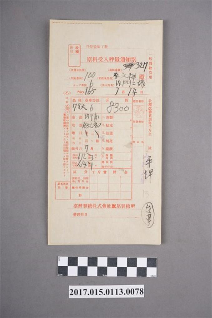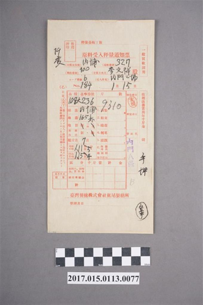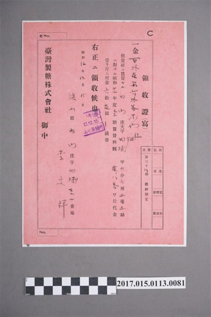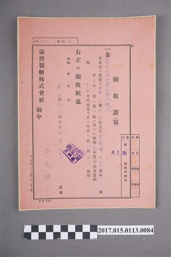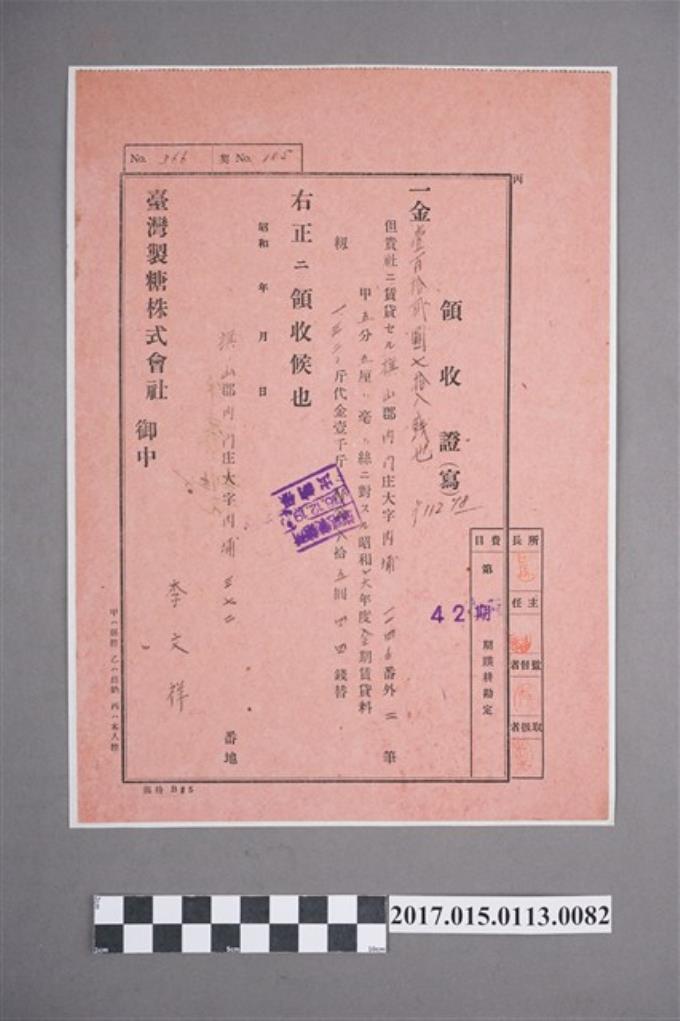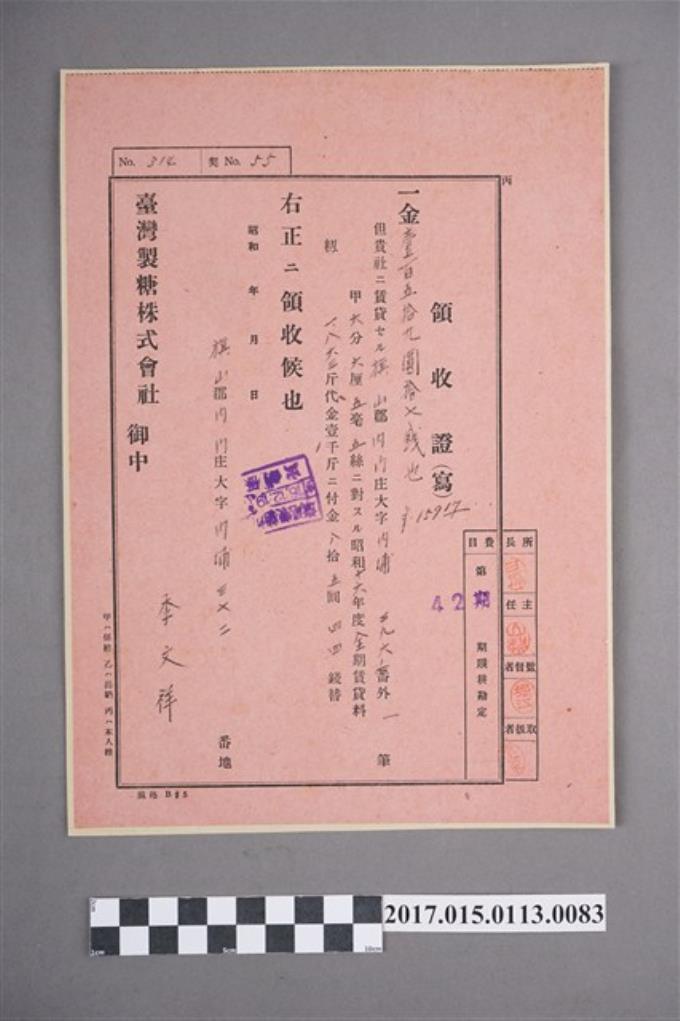 旗山郡內門莊自內埔三十二番地李文祥領收證