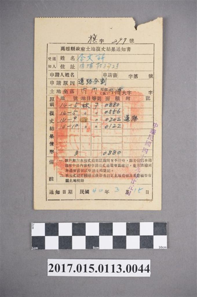 民國40年李文詳高雄縣政府土地複丈結果通知書