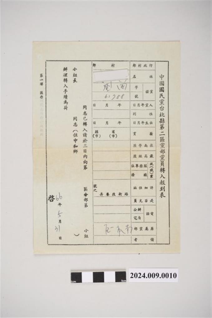 中華民國66年5月31日中國國民黨台北縣第二區黨部黨員轉入報到表