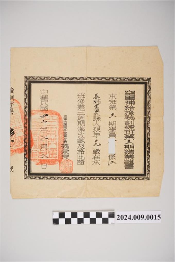 中華民國42年8月8日空軍補給檢驗訓練班第3期結業證書