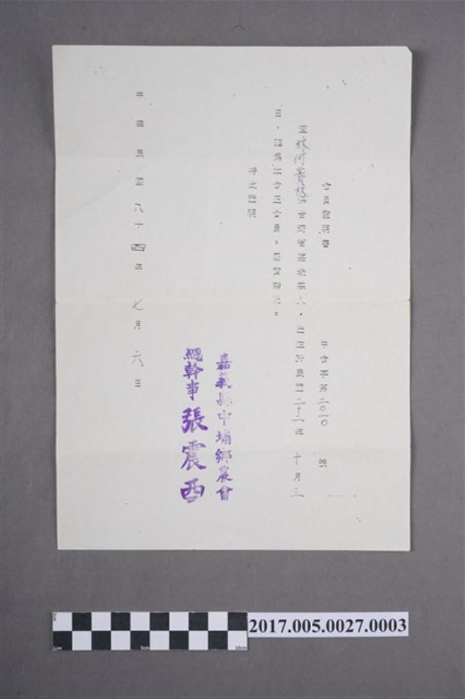 林何賽秋中埔鄉農會入會通知函與會員證明書
