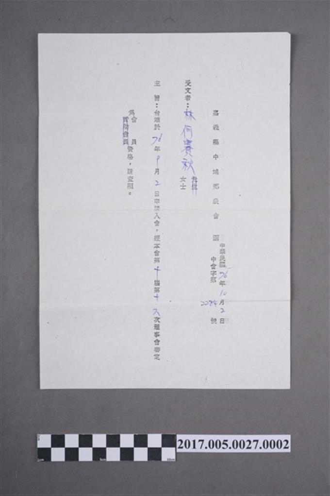 林何賽秋中埔鄉農會入會通知函