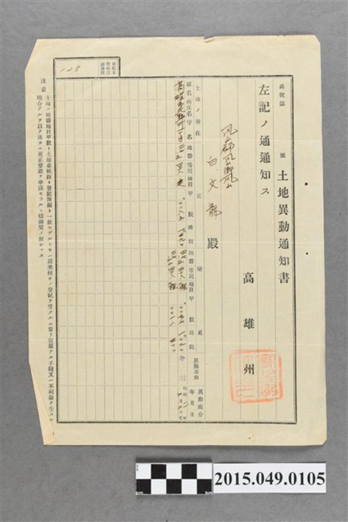 高雄州給白文龍土地異動通知書
