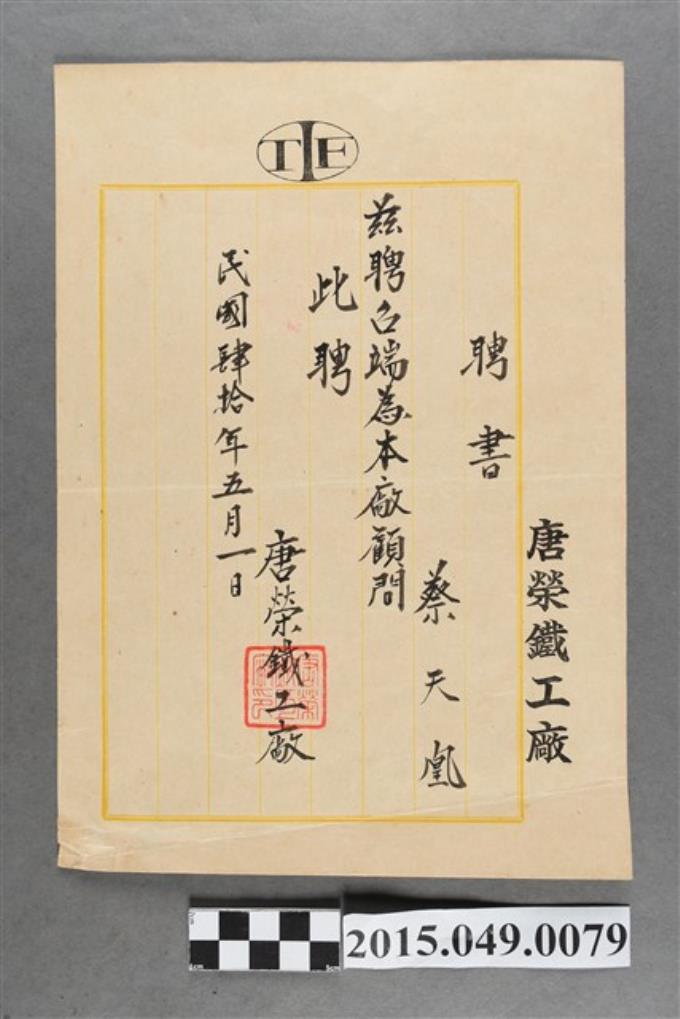 唐榮鐵工廠聘任蔡天凰為顧問聘書
