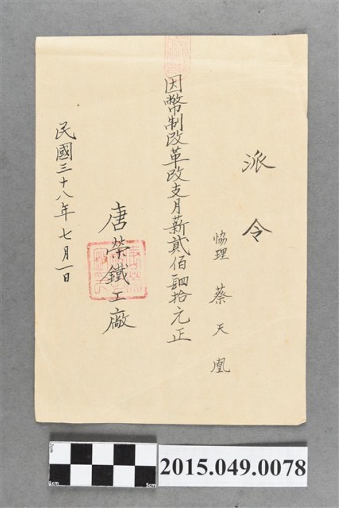 唐榮鐵工廠給協理蔡天凰月薪240元派令