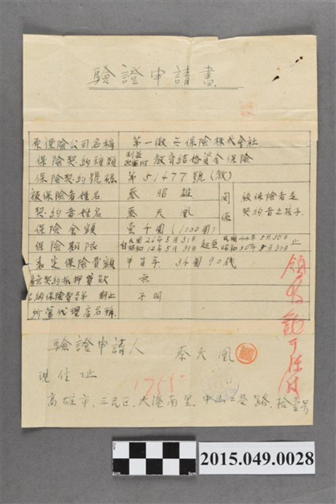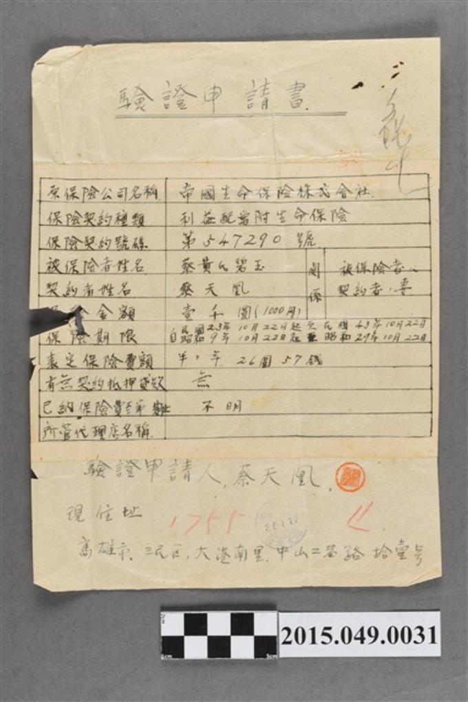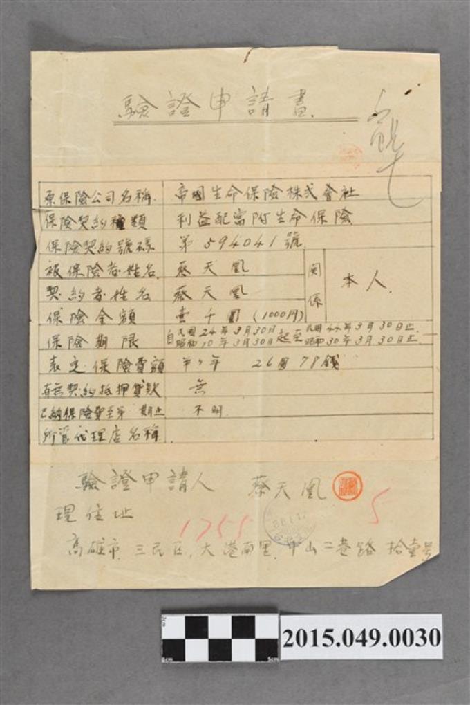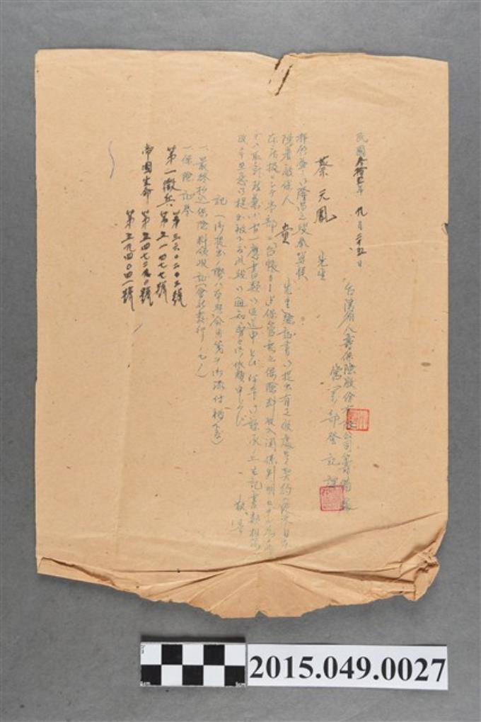 臺灣省人壽保險股份有限公司籌備處發給蔡天凰通知書