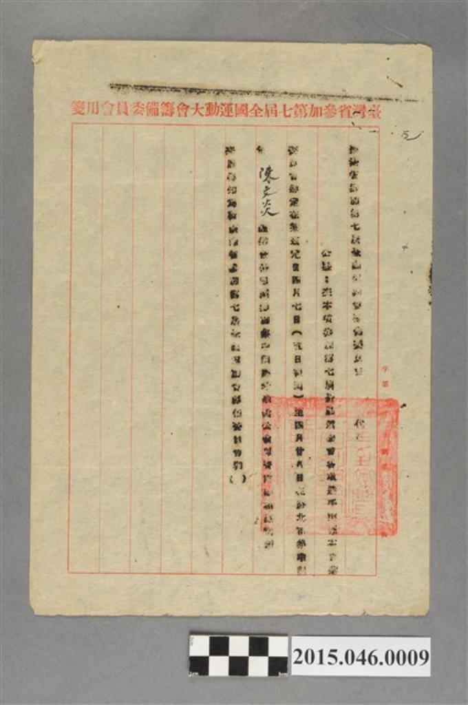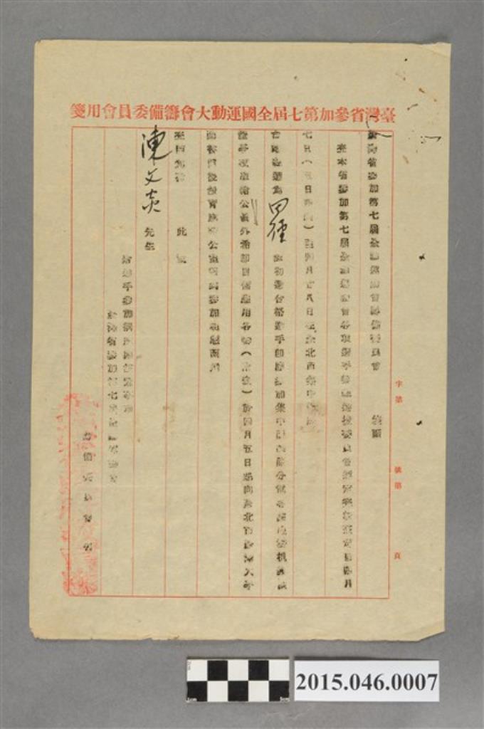 台灣省參加第七屆全國運動大會籌備委員會選拔通知書