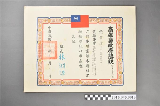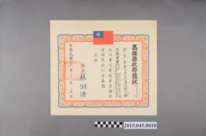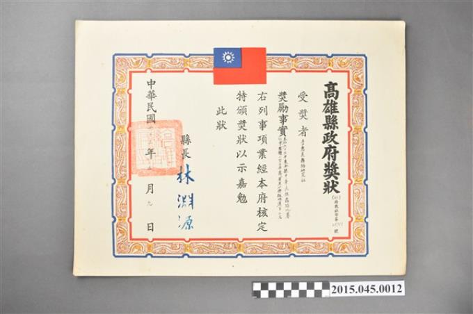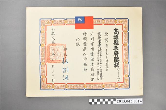 高雄縣政府表彰李惠美舞蹈研究社參加國父紀念館落成啟用典禮特別節目舞蹈表演精彩獎狀