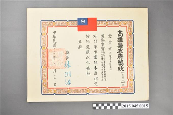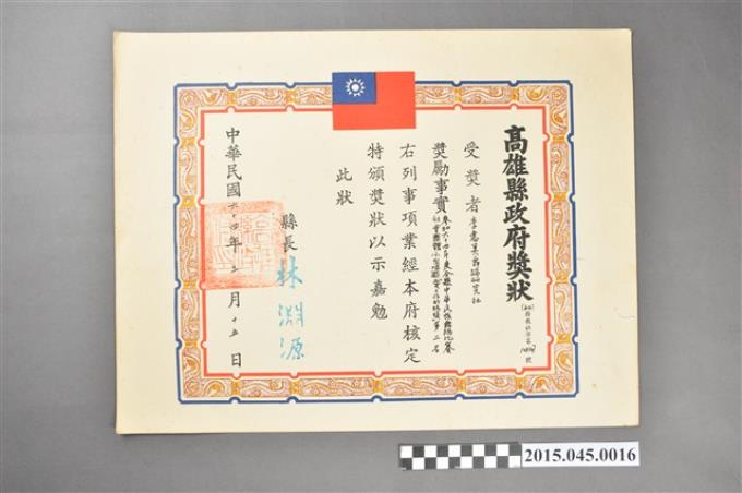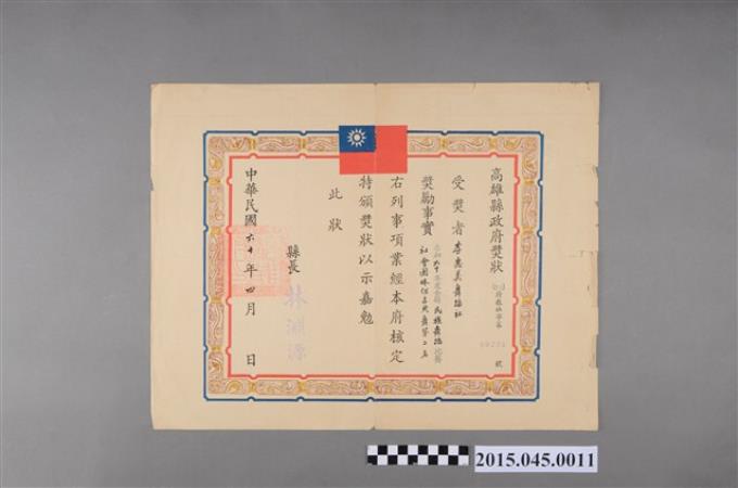 李惠美舞蹈研究社參加高雄縣六十四年度中華民族舞蹈比賽社會團體組小型民俗舞第三名獎狀
