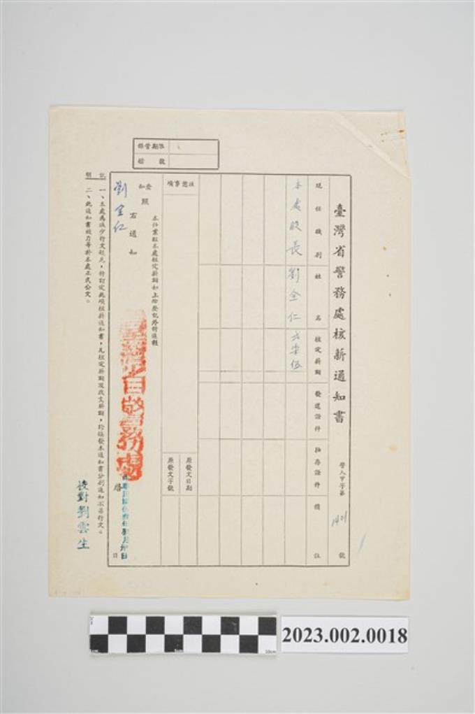 民國53年9月30日劉全仁臺灣省警務處核薪通知書