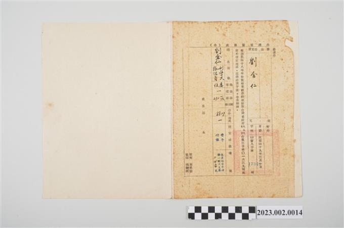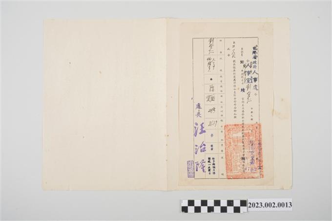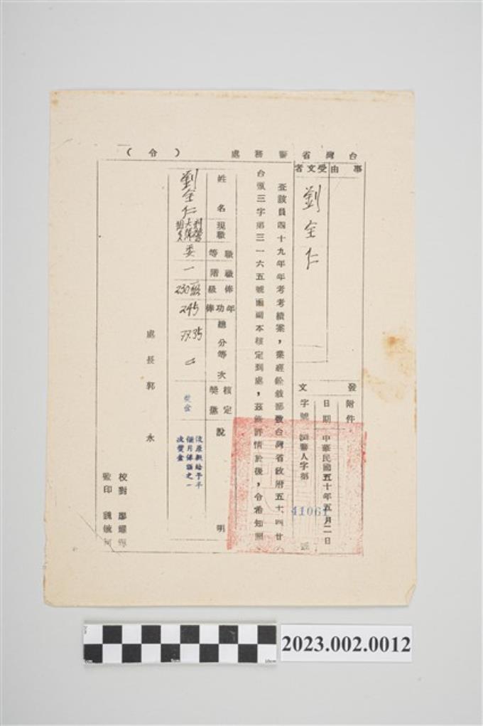 民國53年9月22日劉全仁臺灣省政府核薪通知書