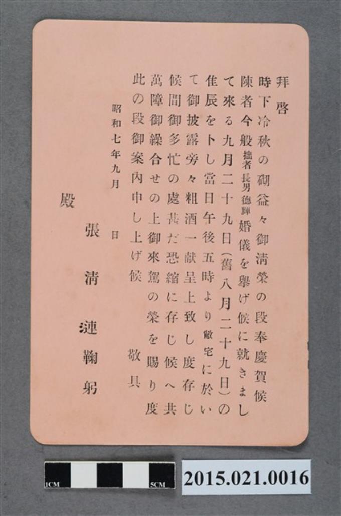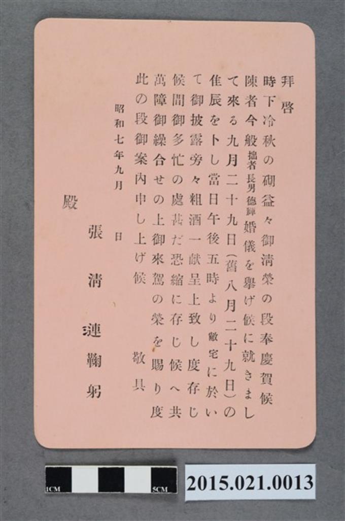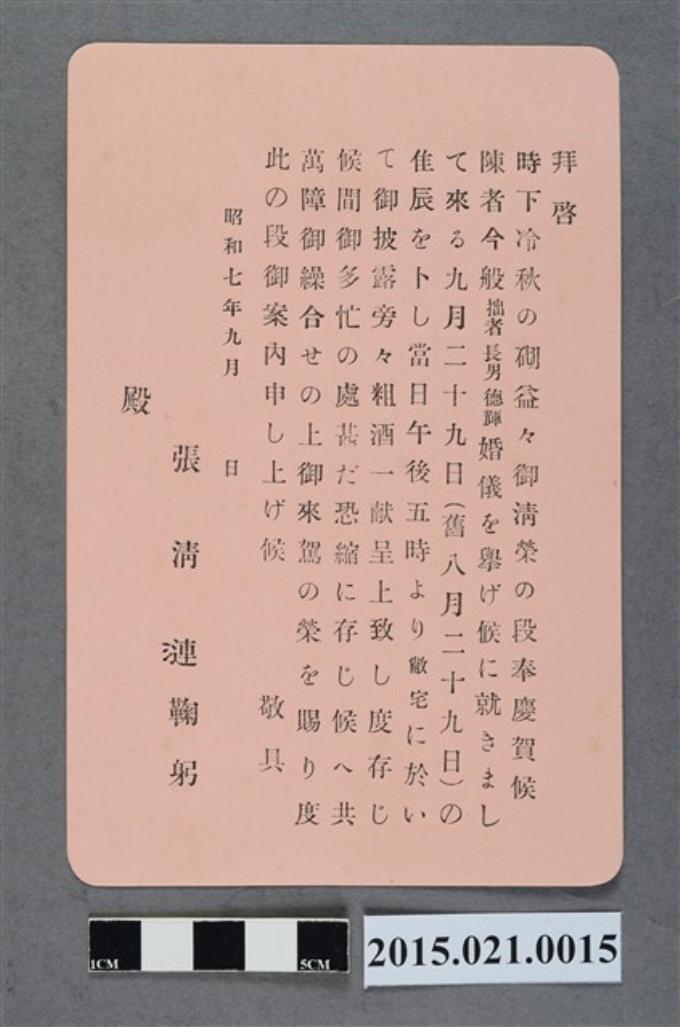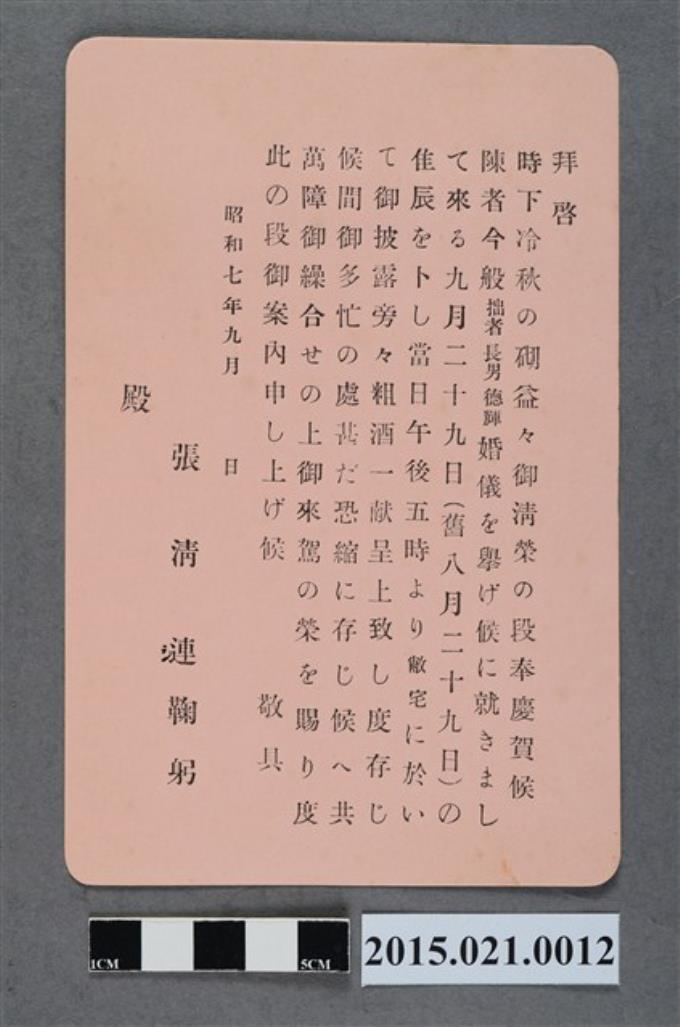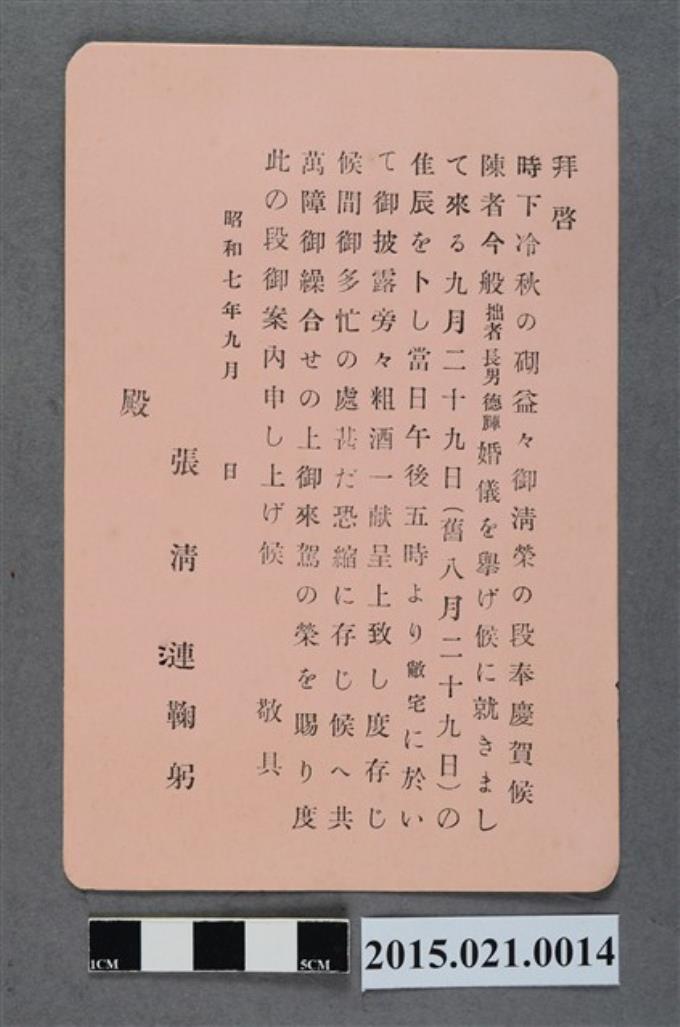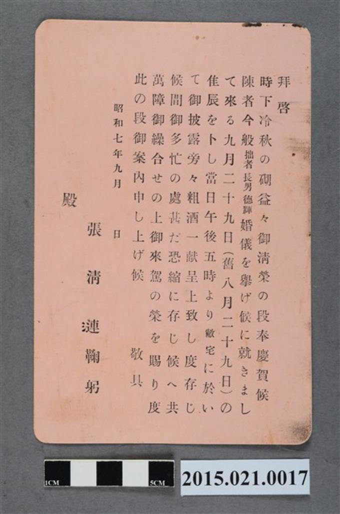 昭和7年9月張清漣之子張德輝結婚婚宴邀請卡