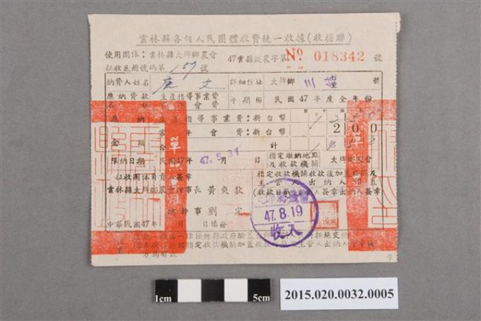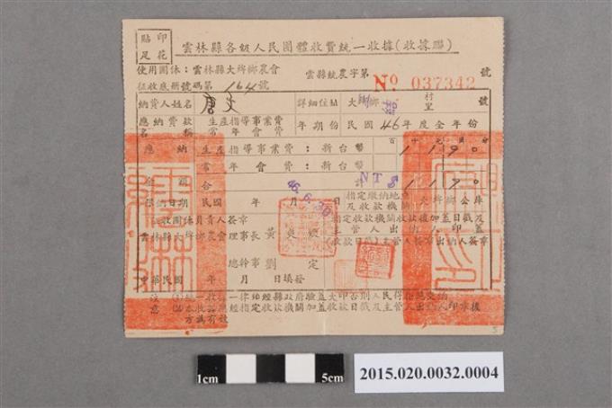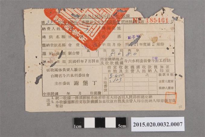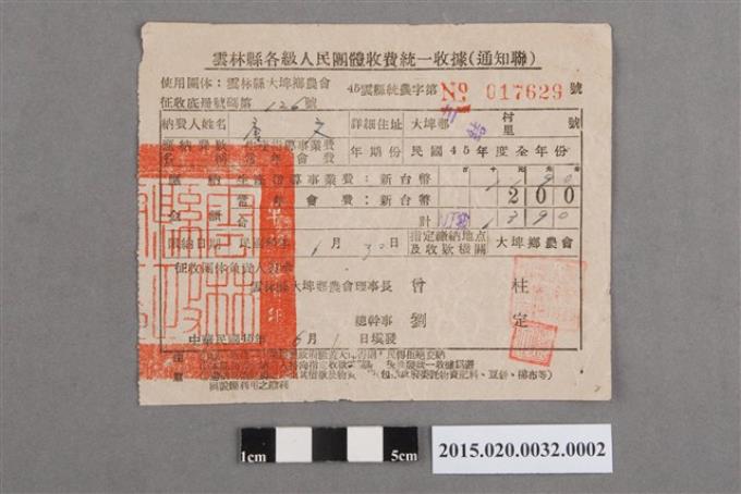 大埤鄉公所給唐文民國43年度第2期份田租繳款收據
